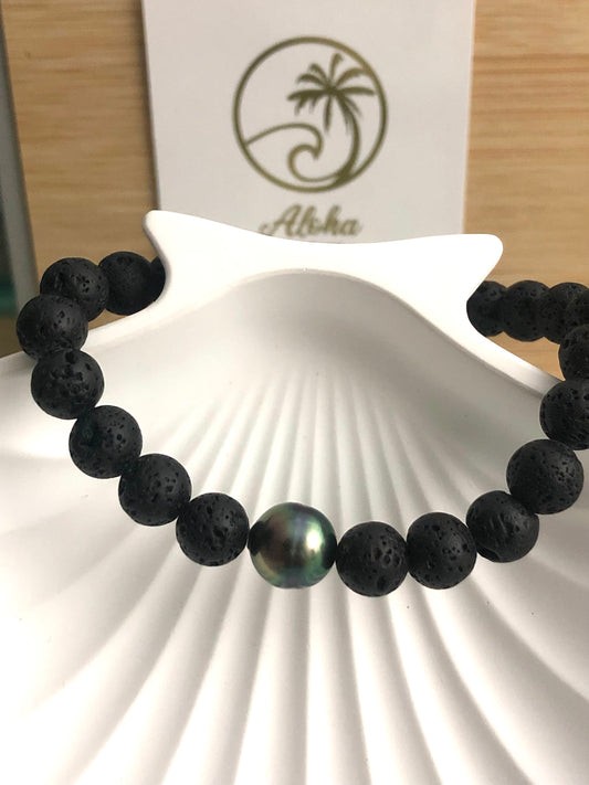 Bracelet Homme Kea, perles de roche volcanique et perle de Tahiti